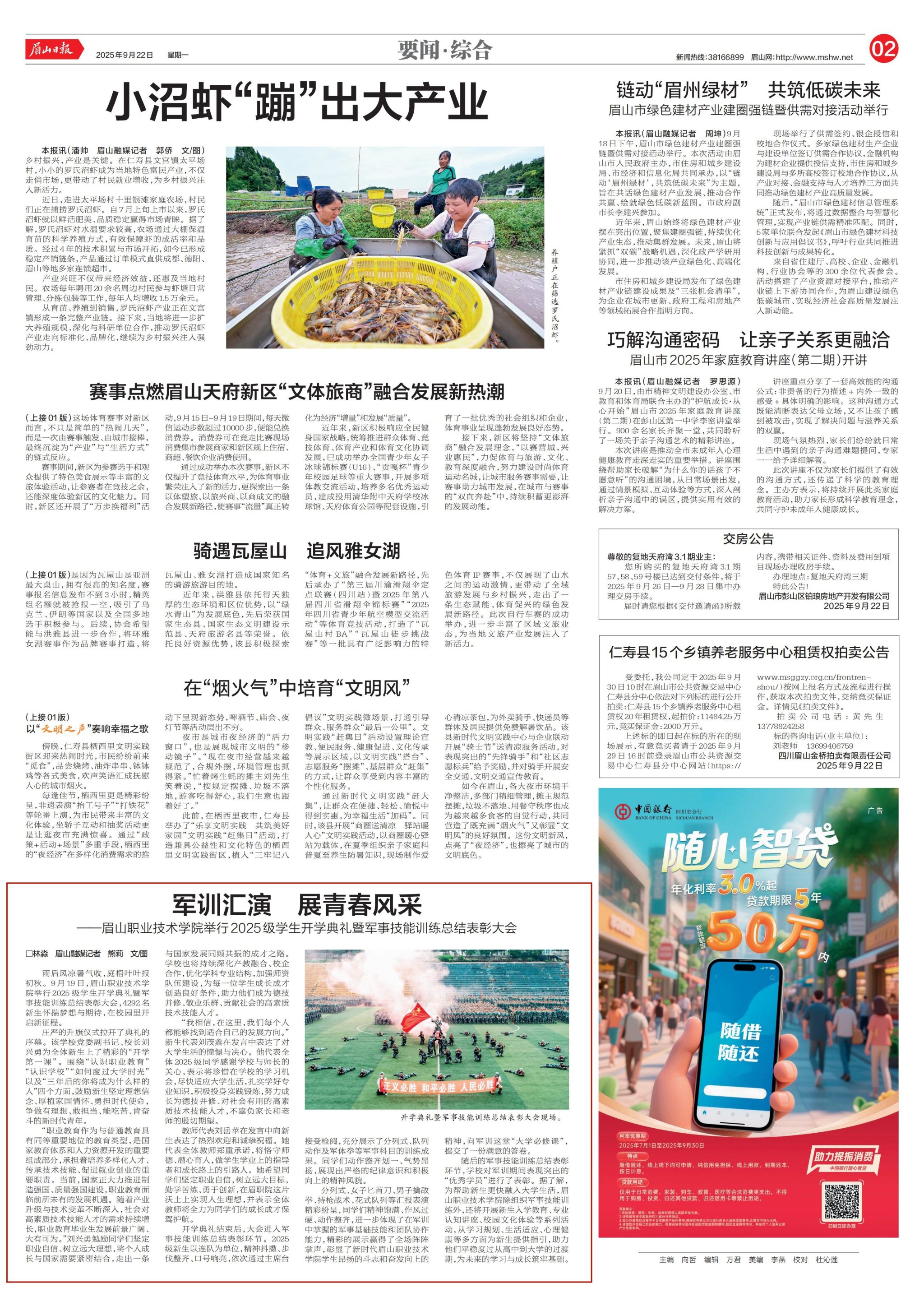 □林淼 眉山融媒记者 熊莉 文/图 雨后风凉暑气收,庭梧叶叶报初秋。9月19日,眉山职业技术学院举行2025级学生开学典礼暨军事技能训练总结表彰大会,4292名新生怀揣梦想与期待,在校园里开启新征程。 庄严的升旗仪式拉开了典礼的序幕。该学校党委副书记、校长刘兴勇为全体新生上了精彩的“开学第一课”。围绕“认识职业教育”“认识学校”“如何度过大学时光”以及“三年后的你将成为什么样的人”四个方面,鼓励新生坚定理想信念、厚植家国情怀、勇担时代使命,争做有理想、敢担当、能吃苦、肯奋斗的新时代青年。 “职业教育作为与普通教育具有同等重要地位的教育类型,是国家教育体系和人力资源开发的重要组成部分,承担着培养多样化人才、传承技术技能、促进就业创业的重要职责。当前,国家正大力推进制造强国、质量强国建设,职业教育面临前所未有的发展机遇。随着产业升级与技术变革不断深入,社会对高素质技术技能人才的需求持续增长,职业教育毕业生发展前景广阔、大有可为。”刘兴勇勉励同学们坚定职业自信、树立远大理想,将个人成长与国家需要紧密结合,走出一条与国家发展同频共振的成才之路。学校也将持续深化产教融合、校企合作,优化学科专业结构,加强师资队伍建设,为每一位学生成长成才创造良好条件,助力他们成为德技并修、敬业乐群、贡献社会的高素质技术技能人才。 “我相信,在这里,我们每个人都能够找到适合自己的发展方向。”新生代表刘茂鑫在发言中表达了对大学生活的憧憬与决心。他代表全体2025级同学感谢学校与师长的关心,表示将珍惜在学校的学习机会,尽快适应大学生活,扎实学好专业知识,积极投身实践锻炼,努力成长为德技并修、对社会有用的高素质技术技能人才,不辜负家长和老师的殷切期望。 教师代表刘岳苹在发言中向新生表达了热烈欢迎和诚挚祝福。她代表全体教师郑重承诺,将恪守师德、潜心育人,做学生学业上的指导者和成长路上的引路人。她希望同学们坚定职业自信,树立远大目标,勤学苦练、勇于创新,在眉职院这片沃土上实现人生理想,并表示全体教师将全力为同学们的成长成才保驾护航。 开学典礼结束后,大会进入军事技能训练总结表彰环节。2025级新生以连队为单位,精神抖擞、步伐整齐、口号响亮,依次通过主席台接受检阅,充分展示了分列式、队列动作及军体拳等军事科目的训练成果。同学们动作整齐划一、气势昂扬,展现出严格的纪律意识和积极向上的精神风貌。 分列式、女子匕首刀、男子擒敌拳、持枪战术、花式队列等汇报表演精彩纷呈,同学们精神饱满、作风过硬、动作整齐,进一步体现了在军训中掌握的军事基础技能和团队协作能力,精彩的展示赢得了全场阵阵掌声,彰显了新时代眉山职业技术学院学生昂扬的斗志和奋发向上的精神,向军训这堂“大学必修课”,提交了一份满意的答卷。 随后的军事技能训练总结表彰环节,学校对军训期间表现突出的“优秀学员”进行了表彰。据了解,为帮助新生更快融入大学生活,眉山职业技术学院除组织军事技能训练外,还将开展新生入学教育、专业认知讲座、校园文化体验等系列活动,从学习规划、生活适应、心理健康等多方面为新生提供指引,助力他们平稳度过从高中到大学的过渡期,为未来的学习与成长筑牢基础。