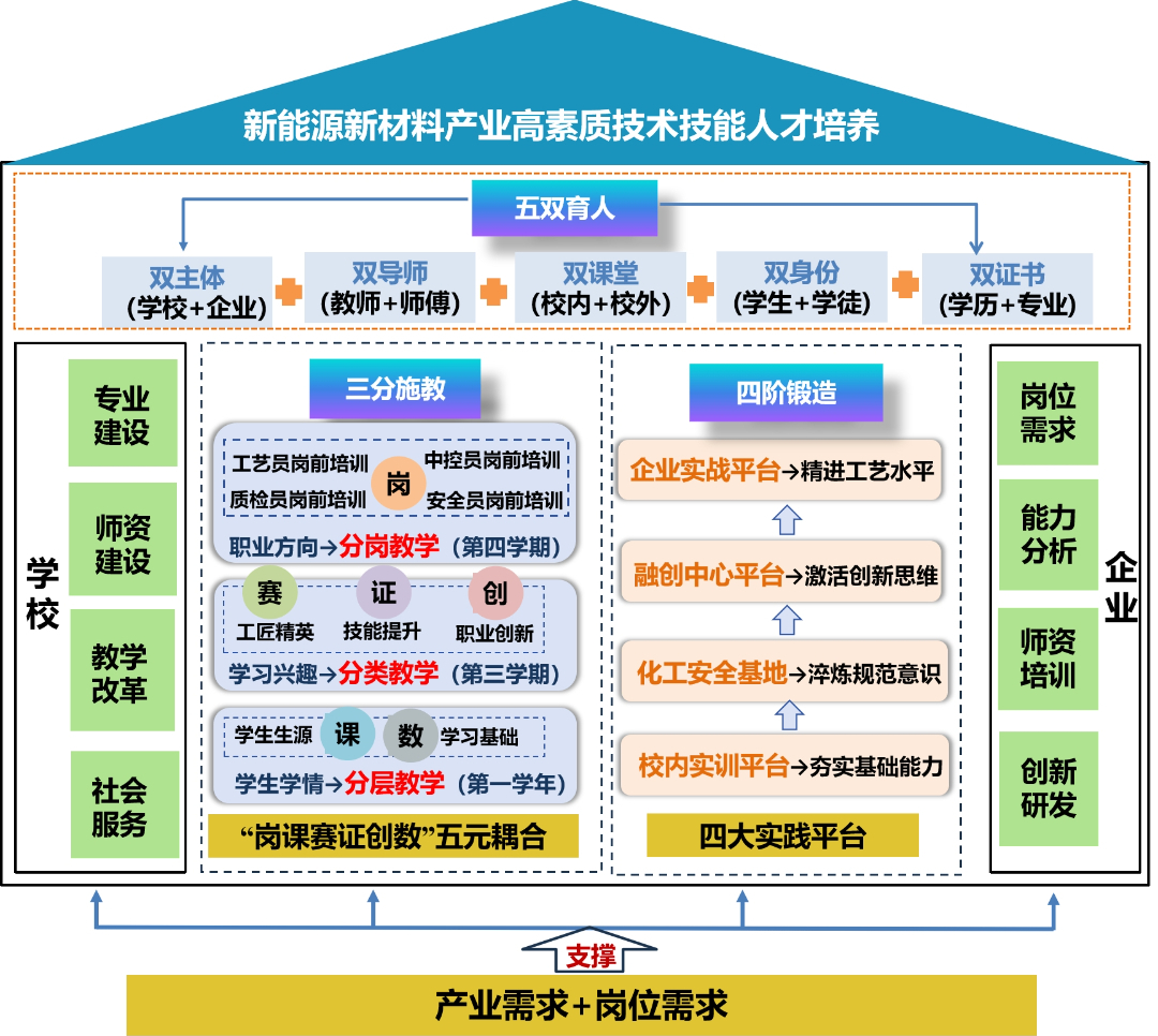 一处相当靠谱的依托。团队依托眉山职业技术学院在新能源新材料领域的丰硕成果,聚焦应用化工技术专业群建设,构建了“基础模块+岗位模块+拓展模块”三级课程体系,实施“岗课赛证”融通育人模式。近年来,团队牵头建成国家级、省级、市级平台5个,包括首批工业和信息化部重点培育中试平台(新能源新材料融合中试平台)、四川省第二批市域产教联合体、四川省高技能人才培训基地等,并与万华化学、金象赛瑞、通威太阳能等20余家行业龙头企业深度合作,开设15个订单班和现代学徒制班,近几年毕业生留眉就业率始终保持在35%以上,专业群在校生近2300人,就业率持续保持在96%以上。