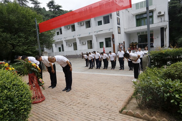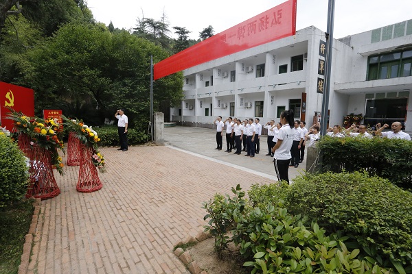 在邓稼先旧居铜像前,党员代表敬献鲜花,全体党员同志鞠躬并齐唱《中华人民共和国国歌》。代贤军带领大家重温入党誓词,誓向革命先辈学习,努力践行为党的事业奋斗终生的庄严承诺。