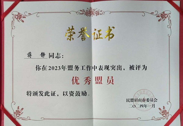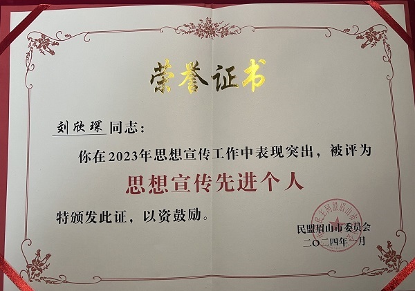会议总结了2023民盟眉山市委的成绩,为了树立典型,进一步鼓舞激励民盟各总支、直属支部和广大盟员继承发扬民盟优良传统,为民盟可持续发展作出贡献,大会对2023年度表现优异、成绩突出的先进集体和优秀个人进行了表彰。我校科技处教师、眉山民盟市直总支高校支部副主委刘欣琛获“思想宣传先进个人”荣誉称号,文化艺术系教师、支部盟员蒋静获“优秀盟员”称号。