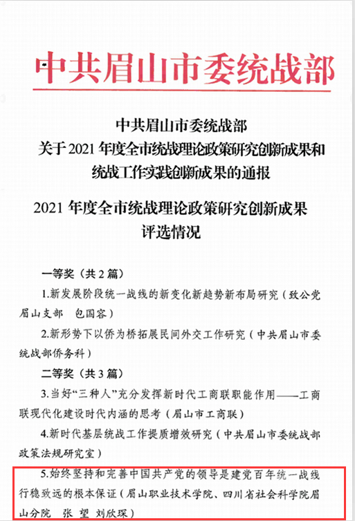 近日,眉山市委统战部经过严格程序认真评选,决定对全市10篇统战理论政策研究创新成果予以通报。我校党委委员、副院长张望主持,教师刘欣琛参与完成的课题《始终坚持和完善中国共产党的领导是建党百年统一战线行稳致远的根本保证》荣获创新成果二等奖。