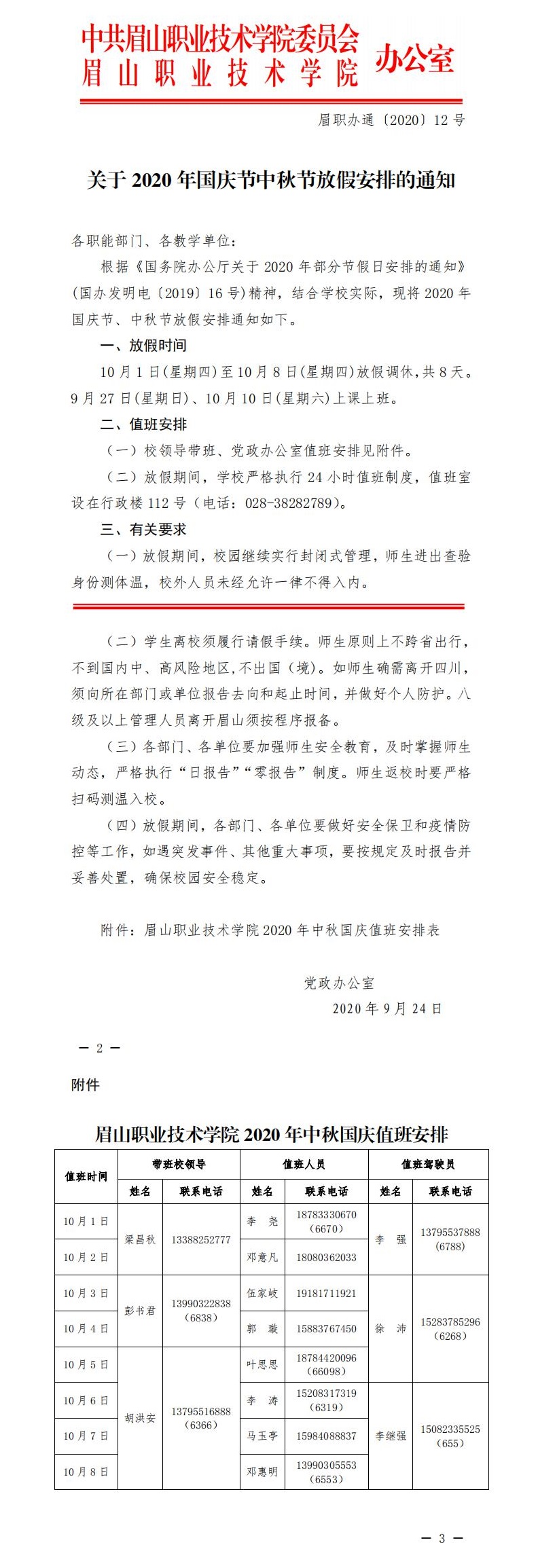 关于2020年国庆节中秋节放假安排的通知
