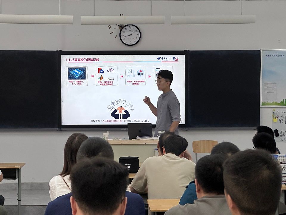 随后,中国电信技术人员结合平台功能与高校科研场景,展开细致讲解与实操演示。针对高校科研常见的四大痛点,团队逐一拆解解决方案:在算力支持方面,平台整合全国A10、3090、4090、A100等多规格算力资源,支持“即买即用”,相比自建算力可节省3年50%成本,适配从基础模型开发到复杂仿真模拟的不同需求;在软件配置方面,预装科学计算、3D渲染、材料分析、AI模型开发等8大类40余款常用科研软件(如Ansys、Matlab、PyTorch等),支持一键启动与跨账号分享,未上架的特定软件可在3日内完成定制部署,大幅降低教师软件配置成本;在学术资源访问方面,依托合规加速引擎,可安全高效访问arXiv、GitHub等跨境学术平台,助力教师便捷开展文献调研与实操验证;在应用适配方面,针对模型开发教学、仿真模拟、3D渲染等不同科研场景,提供从“3060+10核内存”到“A100+18核内存”的阶梯式配置建议,满足多学科科研需求。