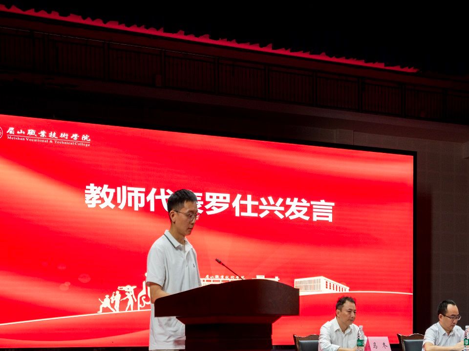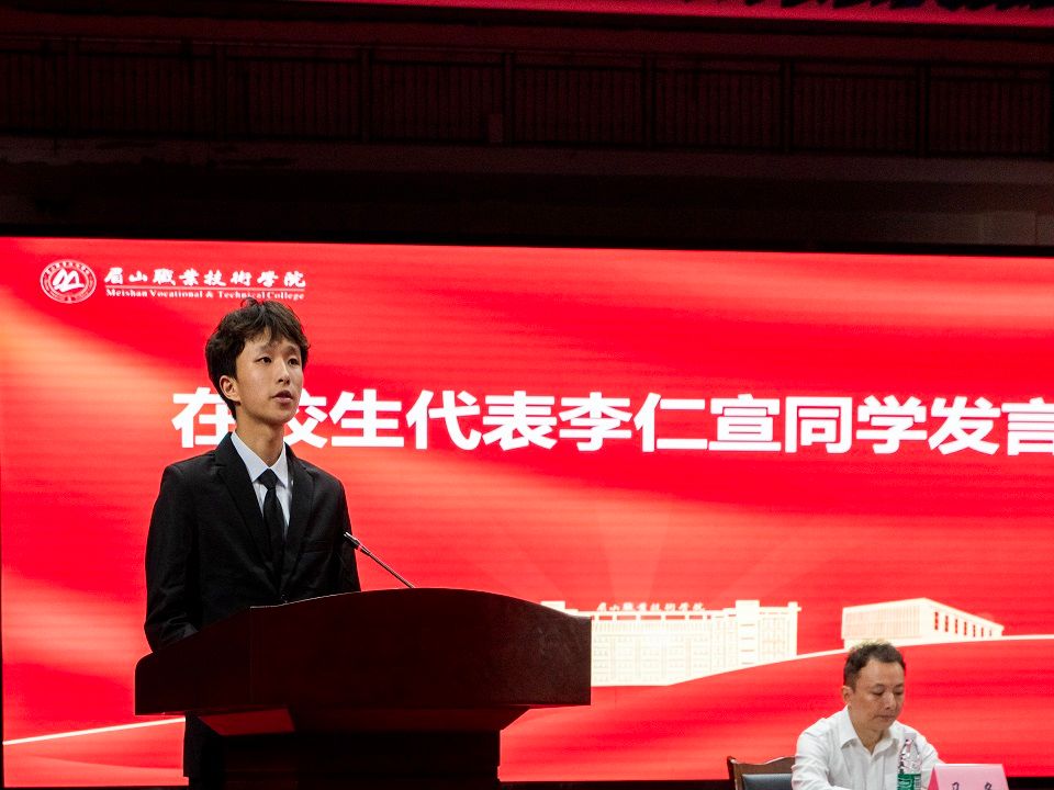 活动在雄壮的中华人民共和国国歌声中正式拉开帷幕。2025级电子信息工程技术专业1班郑尘梅同学作为新生代表发言。她表达了对步入大学校园的激动与憧憬,并表示将珍惜宝贵时光,勤学笃行,练就过硬本领,不负时代,不负韶华。2024级机械装备制造技术专业1班李仁宣同学作为在校生代表分享了在校一年的学习成长经历。他鼓励学弟学妹们要勇于探索、积极实践,在各类竞赛和社团活动中全面提升综合素质。教师代表罗仕兴在发言中向新生们表达了诚挚的欢迎。他结合自身教学经验,希望同学们尽快完成角色转变,学会自主学习,培养批判性思维和创新精神,在智能制造这片沃土上深耕未来。