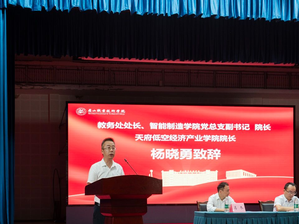 教务处处长、学院院长杨晓勇发表了热情洋溢的致辞。他代表学院向全体2025级新生的到来表示最热烈的欢迎,并详细介绍了学院紧密对接国家战略和区域产业发展需求的办学特色、雄厚的师资力量以及先进的实训条件。杨院长对新生提出三点殷切期望:一要志存高远,将个人理想融入国家发展大局;二要精技强能,在实践中锤炼真本领,弘扬工匠精神;三要全面发展,塑造健全人格,成为德智体美劳全面发展的新时代卓越工程师和技术技能人才。