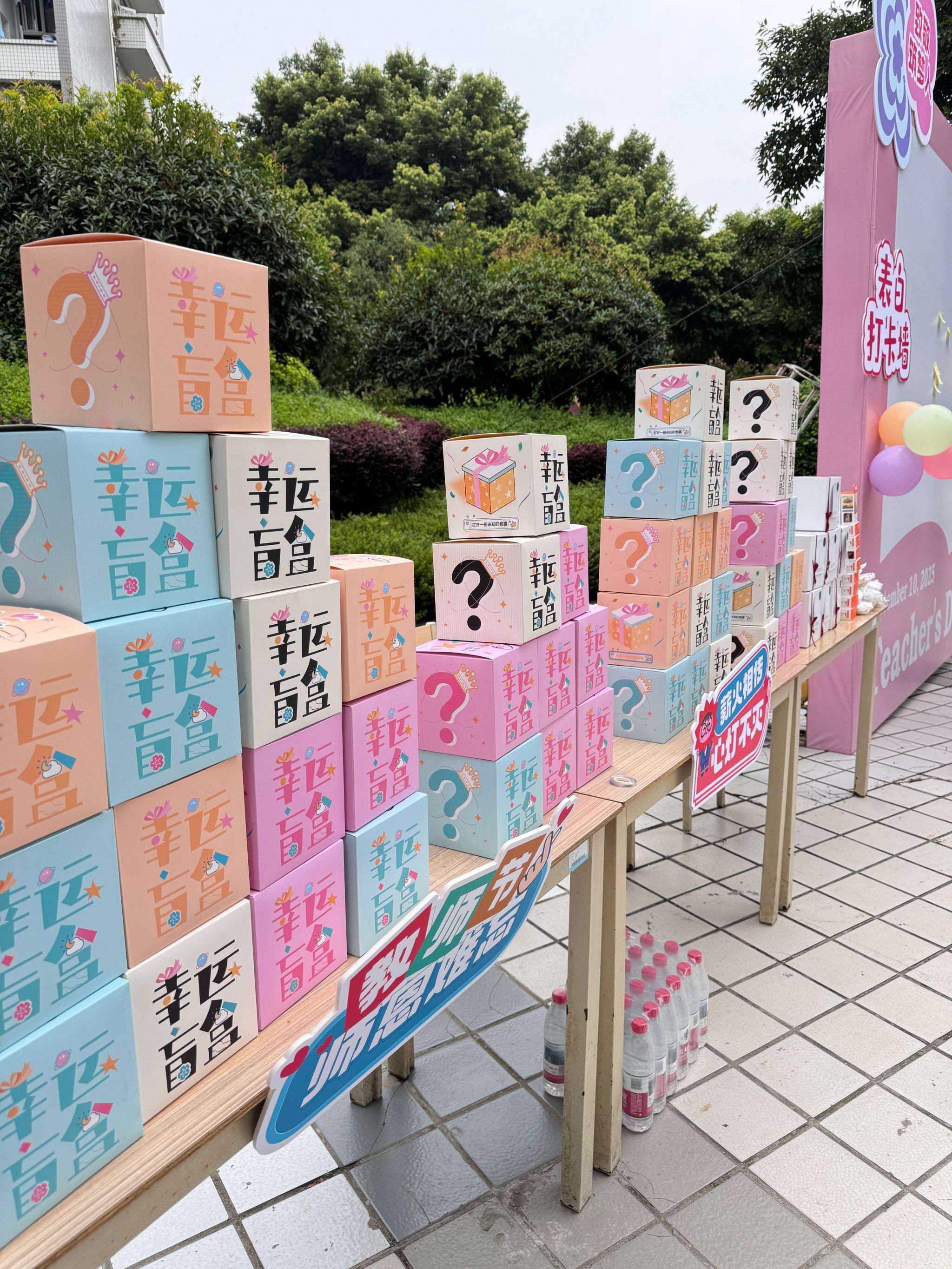 放眼望去,桌上摆满了装有同学们精心制作礼物的盲盒,旁边的教师队伍也排起了长龙,活动现场的环节气氛热烈,教师们踊跃参与,抽取活动礼品。无论是盒子中精致的镜子、实用的笔筒,还是温馨的小礼物,每一份礼物都为老师送去了祝福,为节日增添了欢乐与惊喜。