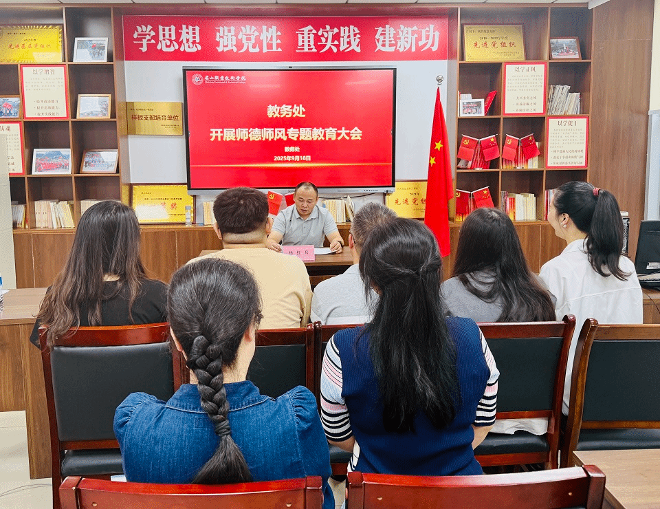 9 月18日下午4:30,教务处在行政楼一楼会议室召开“师德师风专题教育内部学习会”,全处人员悉数参加。会议由教务处处长杨晓勇主持,旨在先学一步、深学一层,为面向全校教师的师德师风建设立标打样。