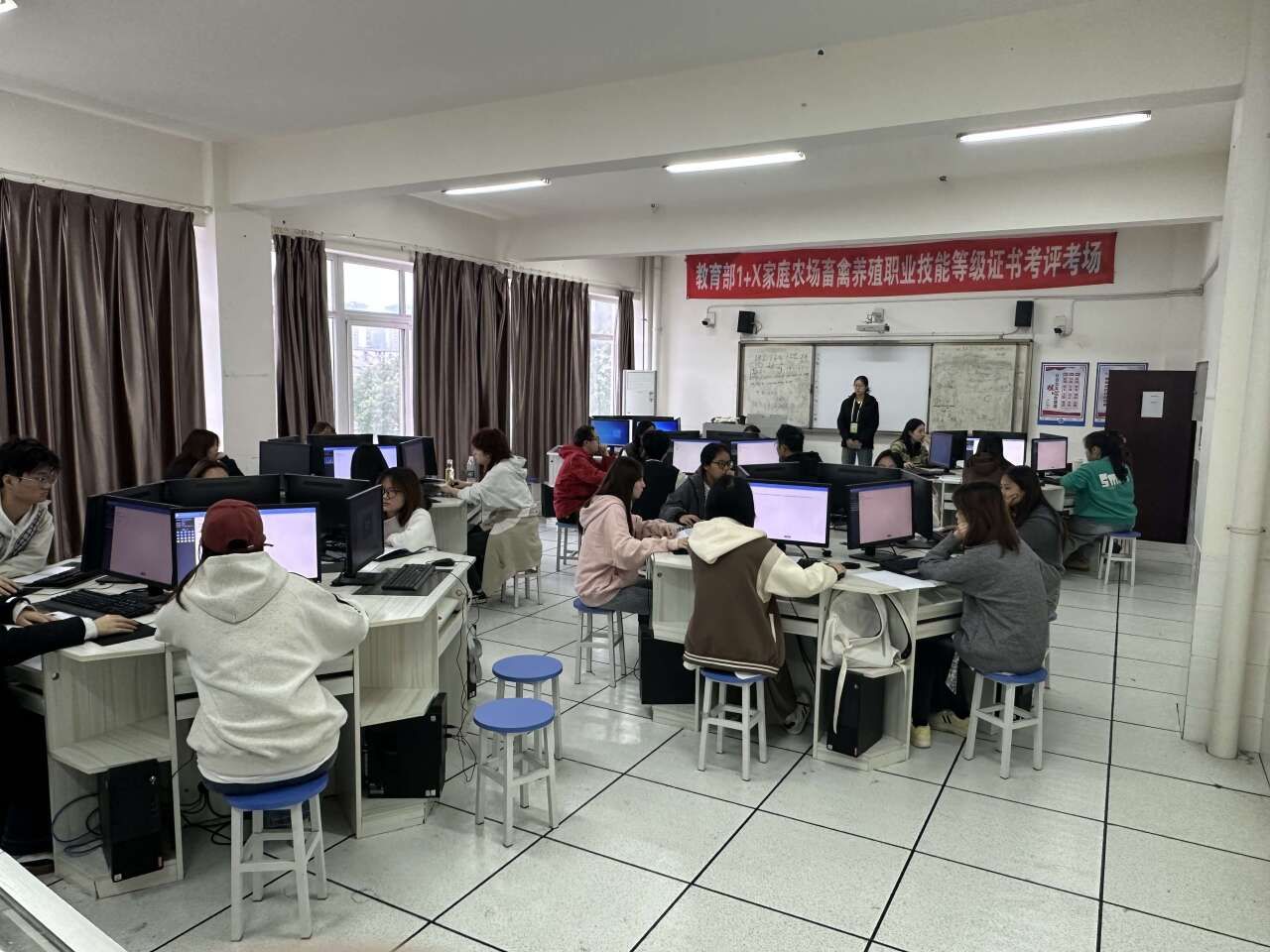 “1+X”家庭农场畜禽养殖职业技能等级(中级)证书考试分为理论和模拟实操两个部分,考试时长共计150分钟,满分100分,全程采用机考方式进行。考试期间,考务人员严格遵守考场纪律,规范监考流程,考试软件和系统运行稳定,考试全程电子监控,各项数据备份有效,考场秩序良好。