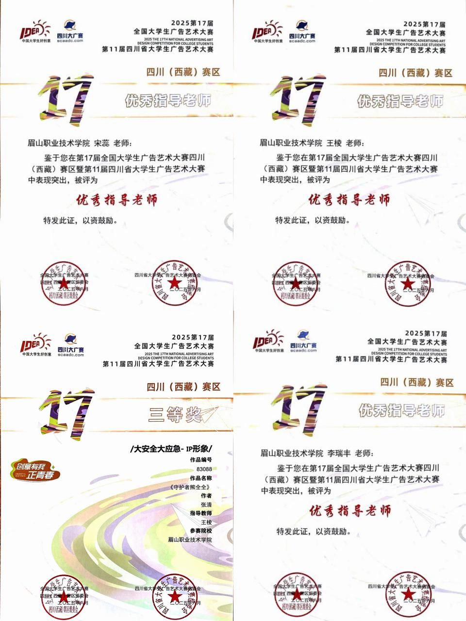 本届大赛迎来重要机制革新,相较往年取消优秀奖设置,仅保留等级奖项,大幅提升了获奖门槛与竞争激烈程度。在高标准、高压力的赛事环境中,我校学子在教育与文化传媒学院王棱、李瑞丰、宋蕊、王卉四位教师的精心指导下,精准把握赛事导向,深耕创作细节,展现出强劲的专业竞争力。其中,蒋婷婷、刘欣雨、柏婉欣团队的《扭出新世界》、郭容菲与古小芳的《星安e消防工作日常》凭借独特创意与精良呈现斩获一等奖;张清的《守护者熊全全》、徐酒与林梦平的《堆堆》、熊仁雨的《纳爱斯养龈健齿牙膏系列包装设计》、郭影与王芯语的《三福—解锁生活的W种脚本》荣获二等奖;吴静的《矿山小精灵“矿啾啾”》、屈佳莹与李靓的《火扑扑表情包》、张馨月与唐悦的《草本色彩交响曲》、王媛与杨佳欣的《摊面与纳爱斯》、蔡东伯与李仁宣的《禁区快门》、黄群清的《文创添彩,忠诚筑防:山河壮丽新篇》及张清的《守护者熊全全》获评三等奖。