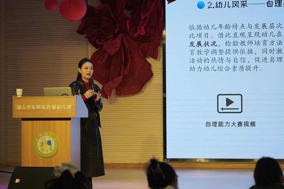 活动第二环节——专题讲座引领,深化课程认知。齐通幼儿园园长赵栩艺以"文化润域,课程赋能"为题,系统介绍了幼儿园的办园历程、文化建设及课程体系的演变过程,并就课程理念、目标设置与内容架构等方面作了详细阐述,展现了园所"以文化人、以课程育人"的教育追求。齐通幼儿园教师郭晋霞围绕"幼儿园一日生活活动与周计划的设计与实施",结合中小大班的具体案例,重点讲解了如何科学安排幼儿一日生活流程,优化生活环节管理,合理制定周计划,实现课程目标与生活教育的有机融合。郭晋霞强调,活动设计与生活管理相辅相成,共同构建支持幼儿内在生长的教育生态。