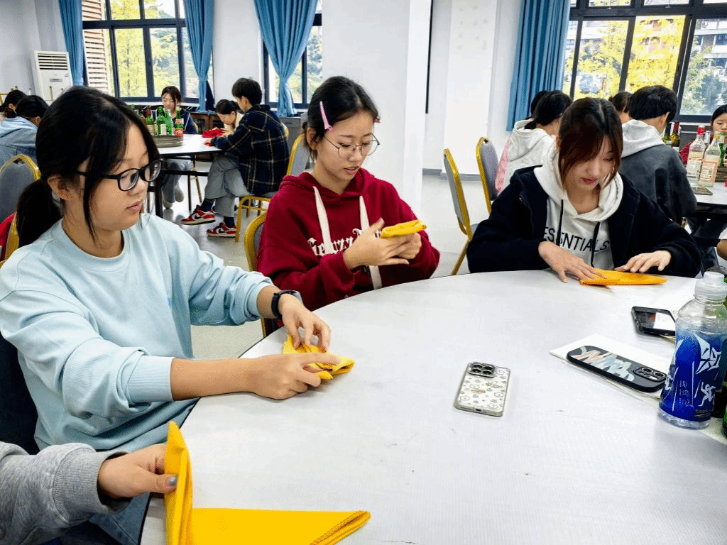 实训聚焦餐饮服务领域核心能力,包括托盘使用、餐巾折花、铺台布、规范摆台四大关键模块,均为酒店及餐饮企业岗位必备的核心技能。实训过程中,专业教师团队采用“示范讲解+一对一纠错+场景化模拟”的教学模式,将每一项操作的标准流程、细节要点逐一拆解,从托盘托举时的手臂角度、重心把控,到餐巾折花中“孔雀开屏”“玫瑰绽放”等造型的折法技巧,再到铺台布时的“一次到位、平整无皱”与摆台时“餐具间距毫米级精准”,教师全程细致指导,确保学生掌握规范操作要领。