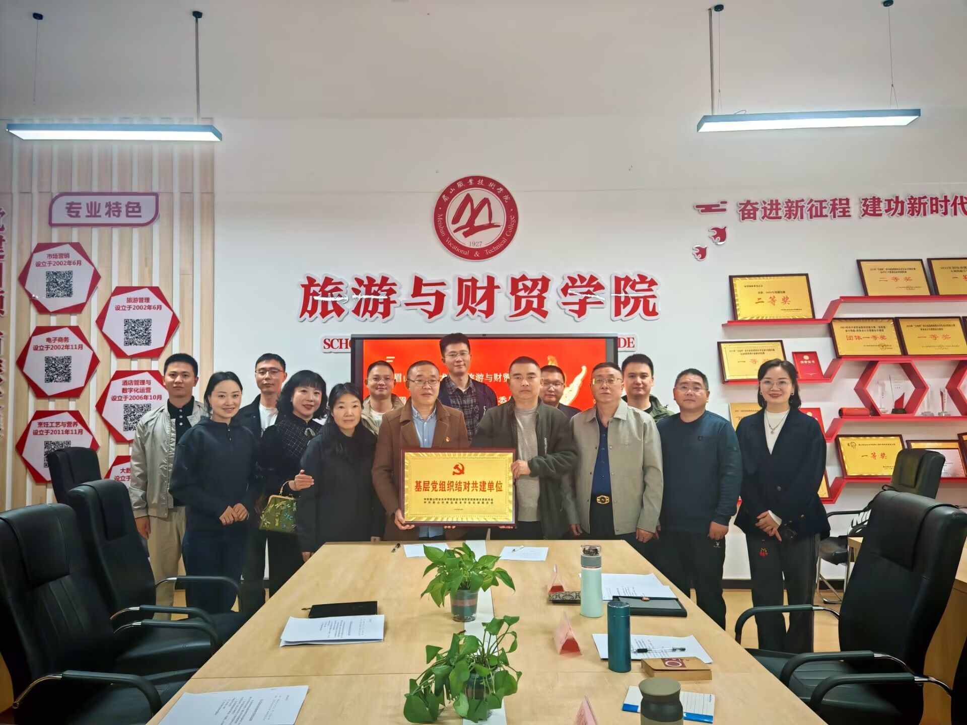 10月21日,旅游与财贸学院教师党支部与眉山市食品安全学会党支部在学校第2教学楼2212会议室联合开展基层党组织结对共建主题党日活动。眉山市食品安全学会会长刘忠、党支部书记刘清华,旅游与财贸学院党总支副书记、院长廖明江,教师党支部书记佘明英以及双方党员参加活动。