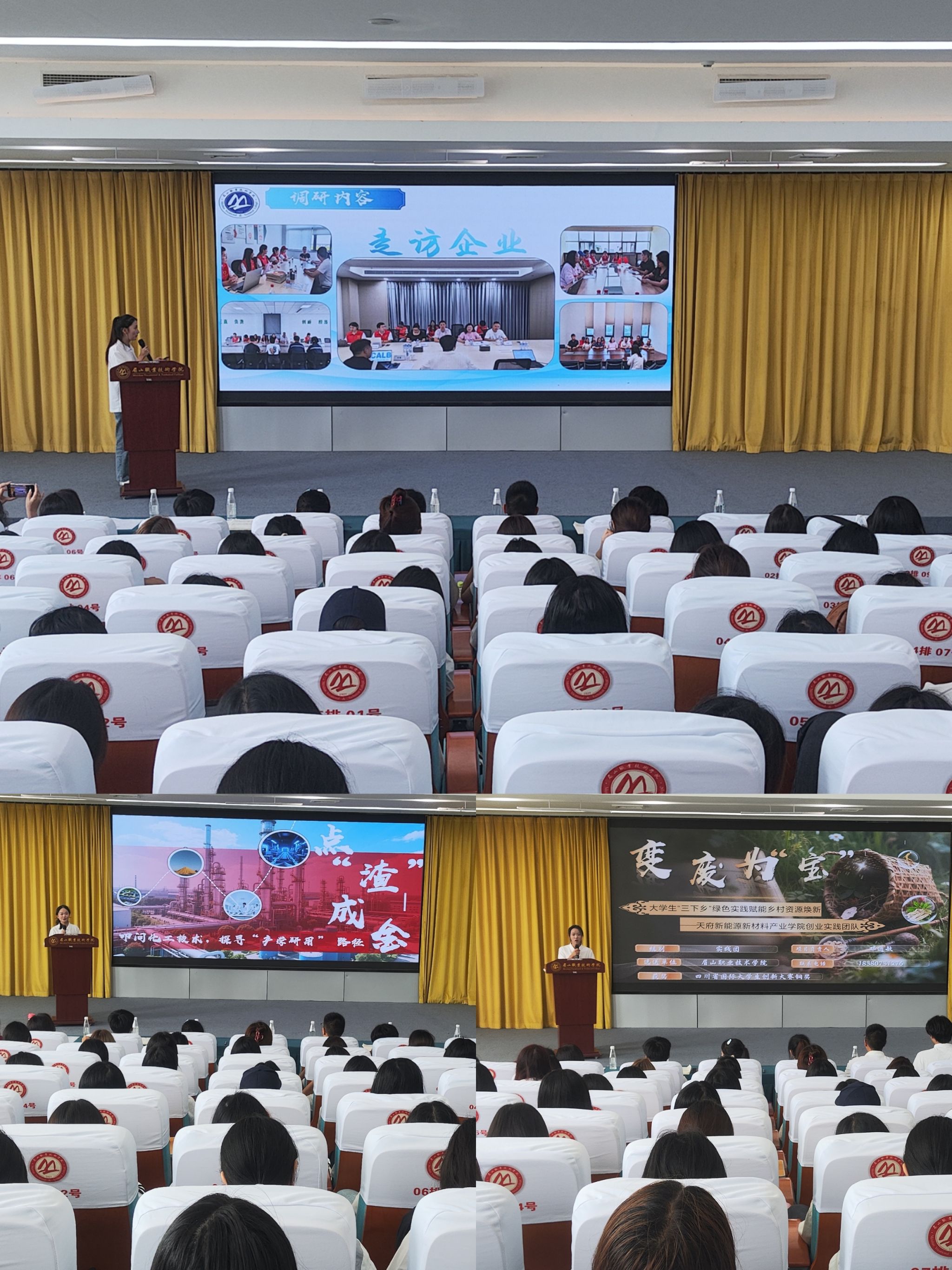 9 月 26 日,天府新能源新材料产业学院在学校招就中心二楼会议室召开暑期社会实践成果汇报暨分享会。学院党总支副书记刘菲出席,学工秘书罗珍主持会议,2024 级全体辅导员及 300 余名学生代表参会。