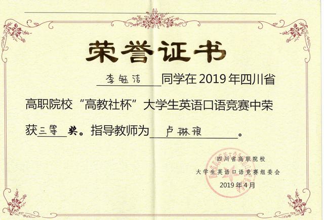 4月4日, 由四川省教育厅主办,四川省高等教育学会高校外语教学研究会和高等教育出版社协办,成都纺织高等专科学校承办的2019年四川省高职院校大学生英语口语技能大赛在成都举行,我校文化艺术系英语教育专业学生李钰洁获得三等奖。