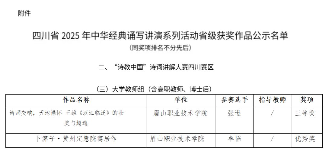 近日,四川省 2025 年 “典耀中华 赓续文脉” 中华经典诵写讲演系列活动结果揭晓,我校通识教育学院教师张逊、牟韬在 “诗教中国” 诗词讲解项目中表现出色,斩获佳绩,为学校争得了荣誉。