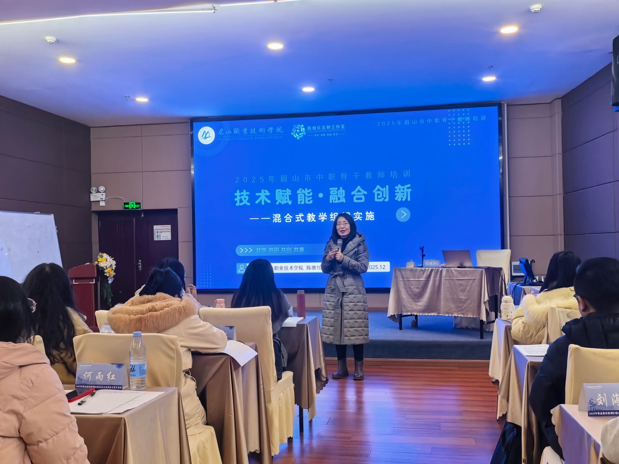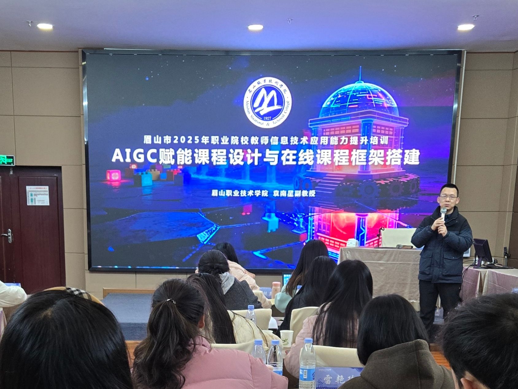 近日,受眉山市教育和体育局邀请,我校计算机教研室承担了眉山市2025年职业院校骨干教师教学能力提升培训的核心授课任务。教研室陈继红教授、袁南星、钟洁、张敏、伍思洁等教师组成专家团队,紧密围绕“人工智能(AI)技术与教育教学深度融合”主题,为来自全市各职业院校的60名骨干教师,开展了一系列前沿、实用、系统的专项培训。