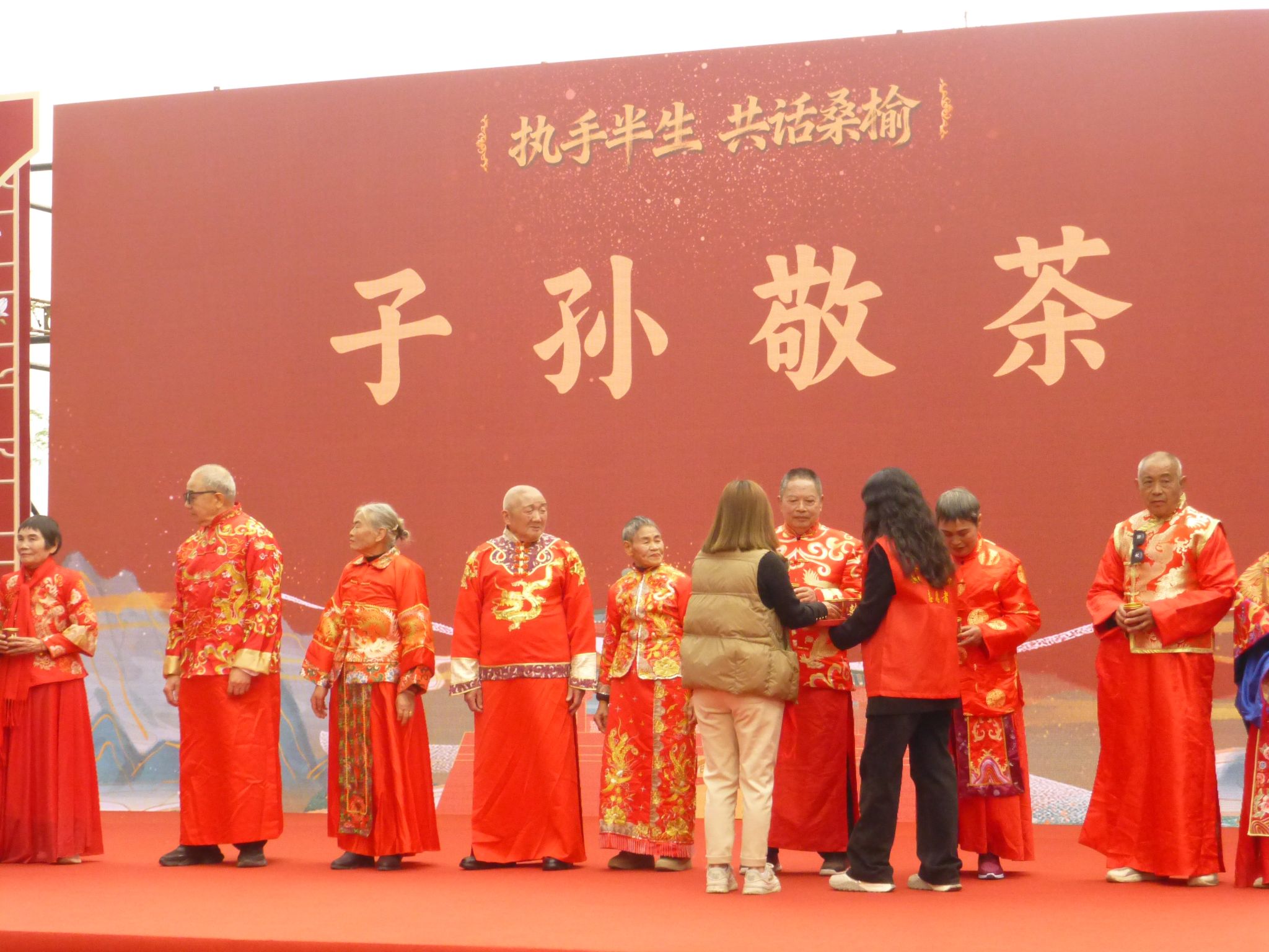活动现场暖意融融,仪式感十足。12对身着大红传统婚服的金婚、银婚夫妇,在20名青年志愿者的全程陪伴与700余名社区居民的真挚祝福中,缓缓踏上红毯,重温携手半生的心动与坚守。银婚夫妇现场演绎“敬拜天地”“共饮合卺酒”等传统婚俗,一招一式间尽显中华优秀传统婚俗文化的深厚底蕴;金婚夫妇端坐台前接受“子孙敬茶”,茶香氤氲中满是家族传承的幸福,随后参与的“云游名山大川”影像拍摄,更将岁月沉淀的爱意永久留存。老人们相濡以沫、互敬互爱的真挚情感,深深打动了在场每一位观众。社区文艺队伍带来的歌舞、戏曲等精彩表演,更让现场掌声不断,处处洋溢着团圆祥和、温馨愉悦的节日氛围。