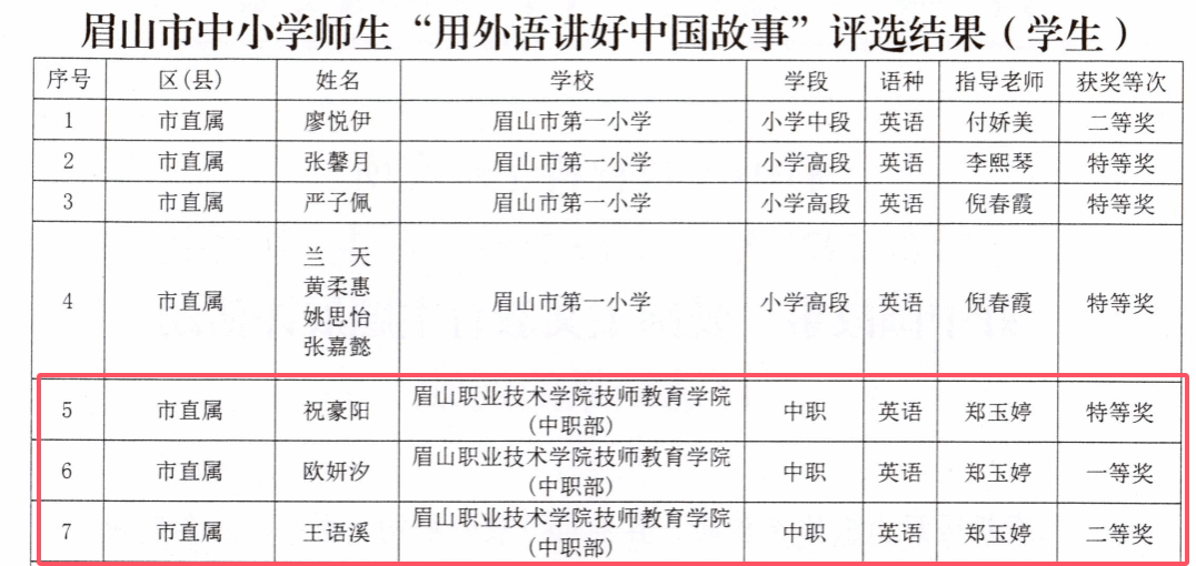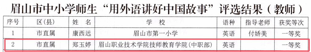 近日, 2025年眉山市中小学师生“用外语讲好中国故事”爱国主义教育主题展评活动评选结果公布。技师教育学院学生祝豪阳斩获中职组特等奖,欧妍汐获中职组一等奖,王语溪获中职组二等奖;教师郑玉婷获中职教师组一等奖。