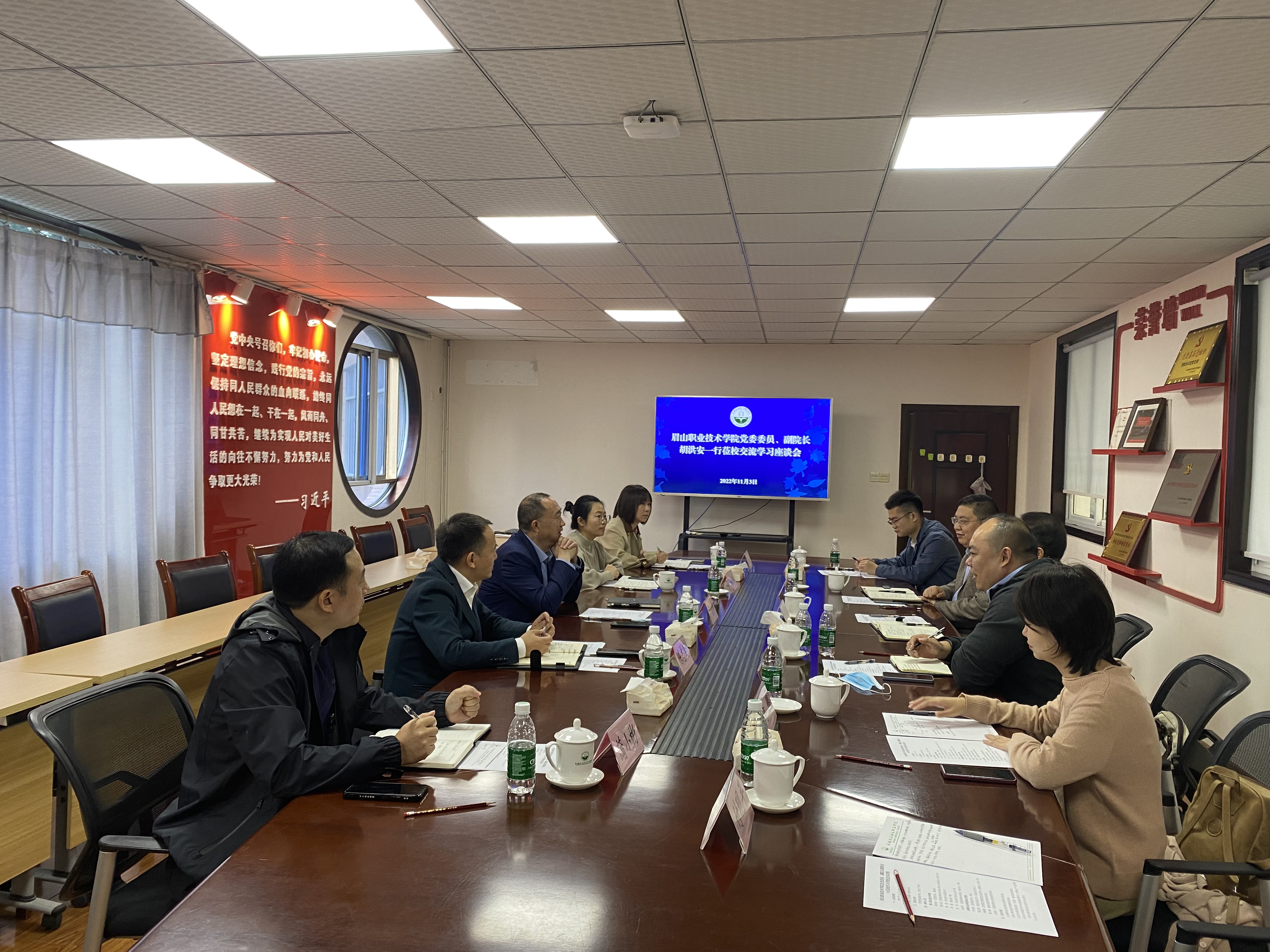 胡洪安一行首先现场参观了成都农业科技职业学院校史馆、成都平原农耕文化馆等。接着,两校开展了工作交流座谈,成都农业科技职业学院相关负责人详细介绍了该校国家“双高“推进机制以及对建设过程中的一些经验和做法进行了交流分享。接着,双方围绕“双高”建设任务过程中的重难点内容进行了沟通交流。双方表示:今后要加强沟通交流,互学互鉴。