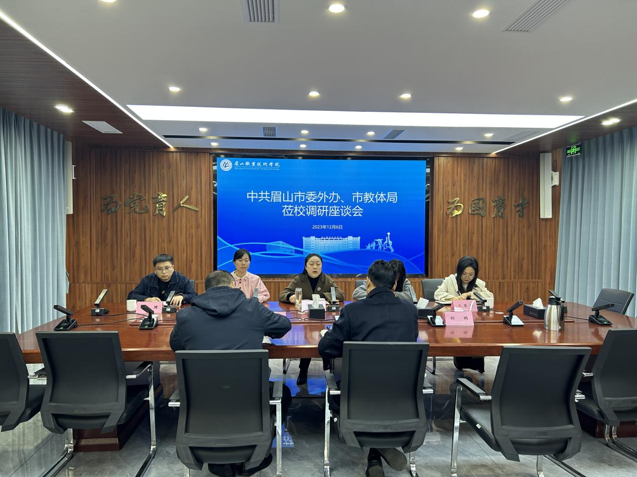 12月6日,中共眉山市委外办副主任张妍与市教体局职成高教科科长黄敏一行5人莅校调研学校国际交流合作相关事宜,座谈会由学校副校长陈光辉主持。