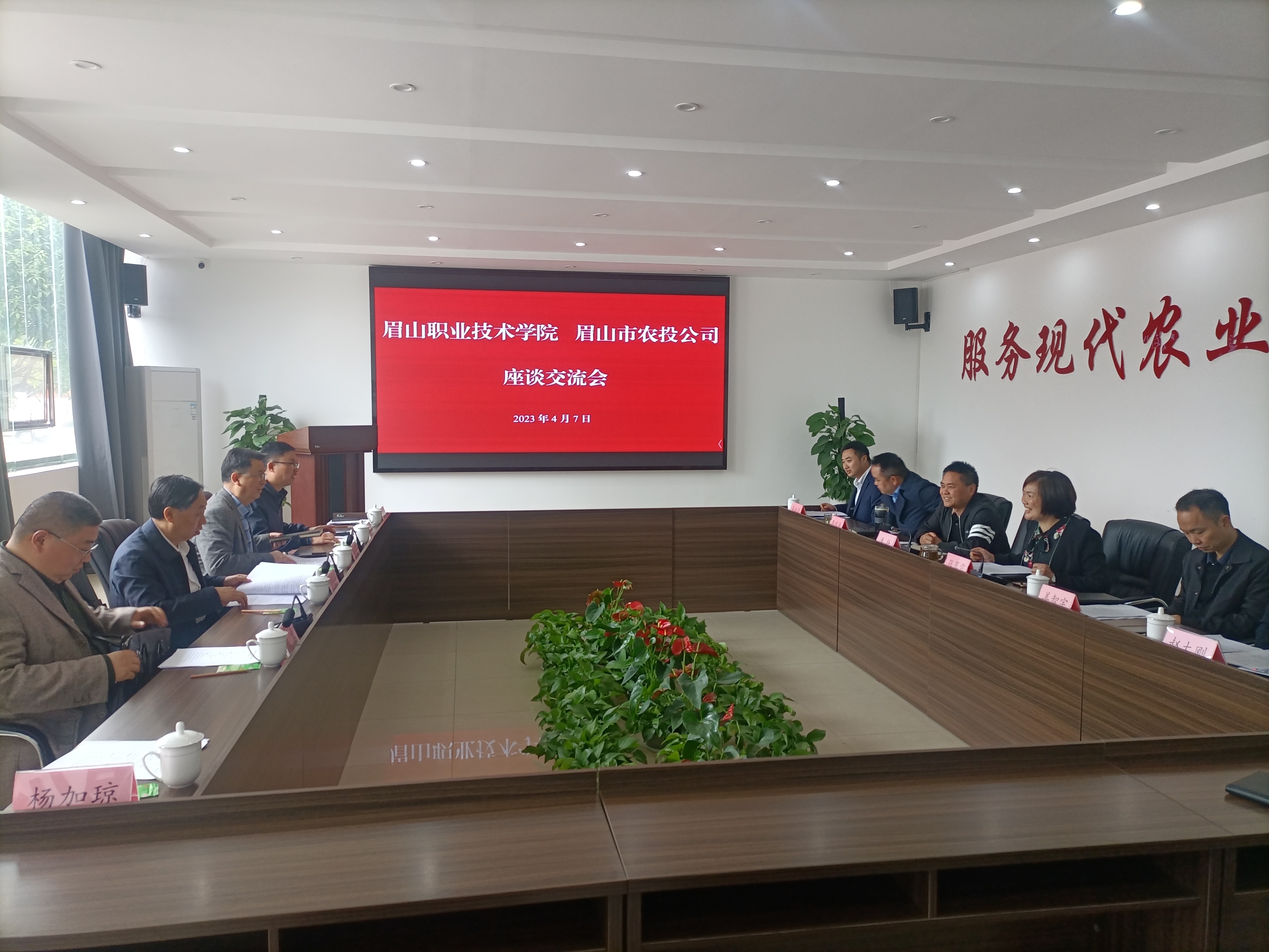 学院党委委员、副院长胡洪安、眉山市农业投资有限公司党总支副书记姜智宇、党委委员、副总经理李鸿海等学校和公司相关人员参加座谈交流。