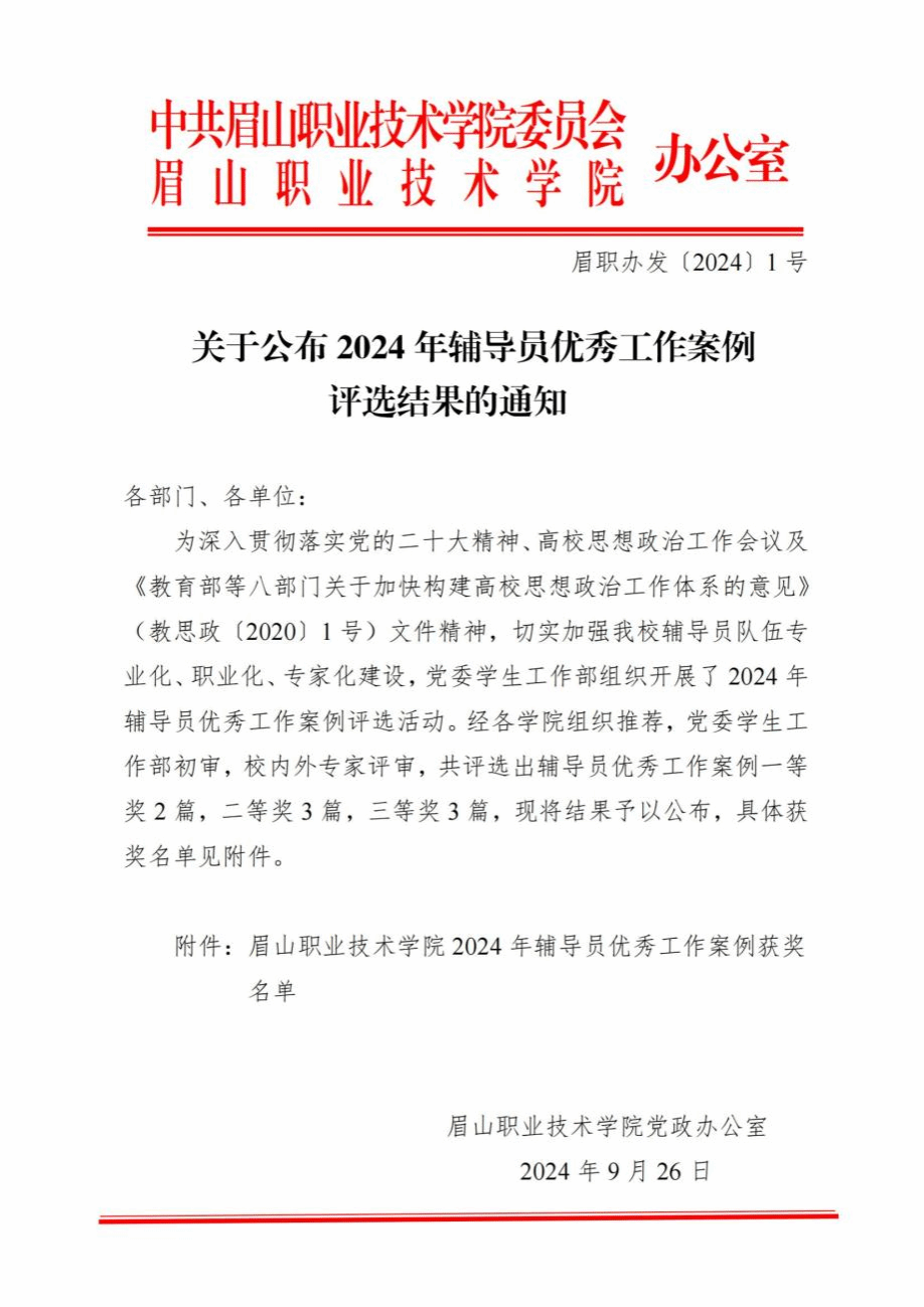 9月26日,学校下发《关于公布2024年辅导员优秀工作案例评选结果的通知》(眉职办发〔2024〕1 号),我院党总支副书记潘复超、辅导员薛伟、周密思撰写的案例《聚焦“五大抓手”,坚持“五位一体”,营造“五学氛围”——智能制造学院构建学风建设长效机制》荣获学校2024年辅导员优秀工作案例一等奖。