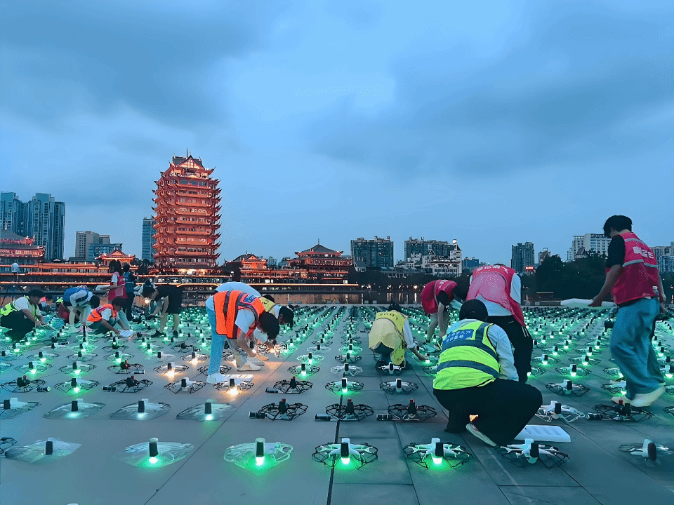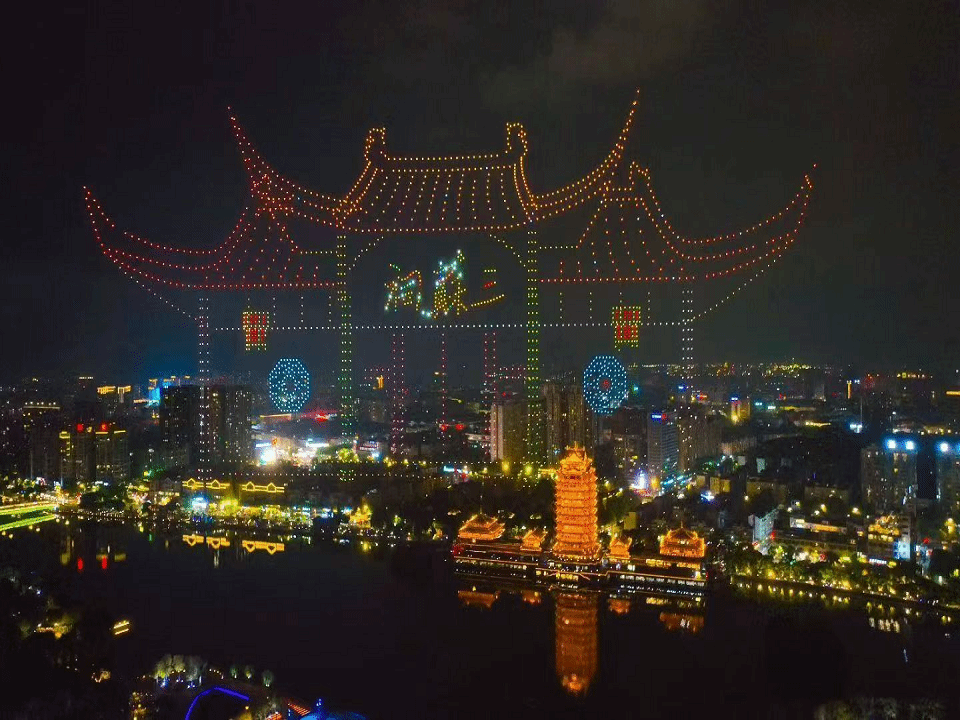 9月20日晚,活动迎来高潮。2000架无人机同步腾空,以夜空为幕布、以灯光为画笔,通过精准的编队操控与灵动的灯光变换,打造出绚丽多彩的动态画面。此次灯光秀创新性融入三苏祠、三苏雕像等东坡文化核心元素,将现代科技的炫酷与千年文化的厚重巧妙融合,既展现了低空经济领域的技术魅力,又传承了地方优秀传统文化,引得现场观众连连惊叹、掌声不断。