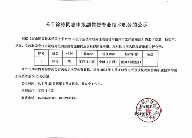 关于徐彬同志申报副教授专业技术职务的公示