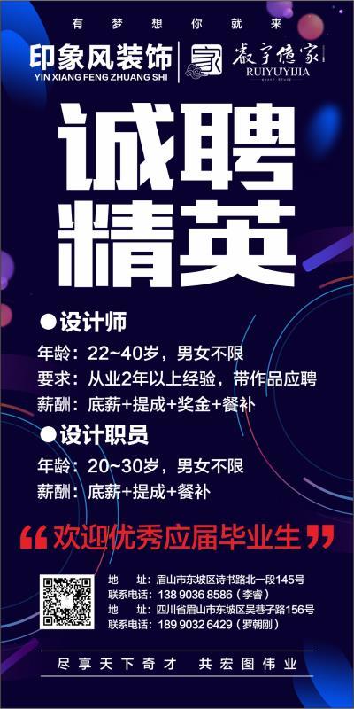 印象风装饰设计工程有限公司位于大文豪苏东坡的故乡--眉山,眉山 眉山市东坡区吴巷子路52号1层,于2004年06月09日在眉山市工商行政管理局注册成立,注册资本为160 万,在公司发展壮大的16年里,始终为客户提供好的产品和技术支持、健全的售后服务,公司主要经营室内外装饰工程设计、施工(按资质证开展经营活动)。现根据工作需要招聘: