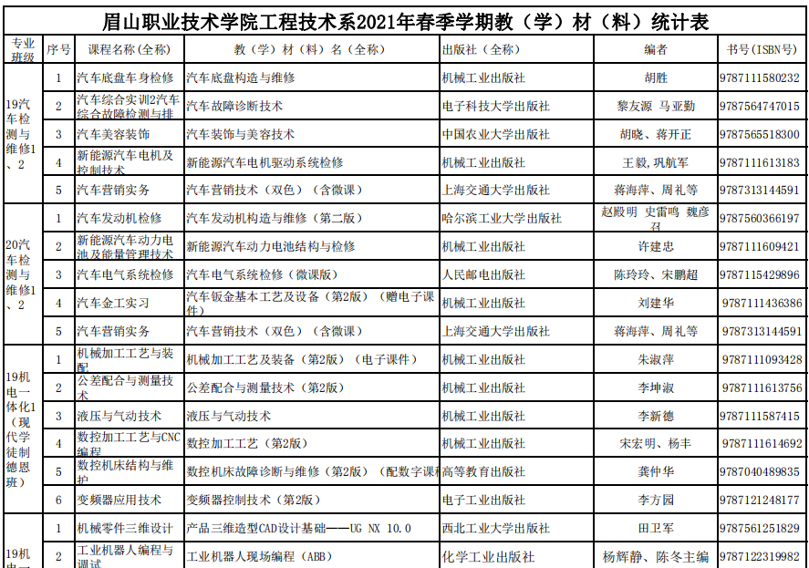 工程技术系严格规范教材选用程序,在确保公开、公平、公正的基础上,经由各教研室集体研究、系教材选用委员会核实,确定了工程技术系2021年春季教材选用结果。现将结果予以公示,详见附件。公示期为2020年12月28至2021年1月4日(5个工作日)。单位或个人如反映有关眉山职业技术学院工程技术系(2020-2021) 学年度第(2)学期教材选用的违纪违规情况,请在公示期内,向工程技术系纪委委员处举报。举报受理电话:15283788508,18381313320;电子邮箱:7240856@qq.com、215806082@qq.com。