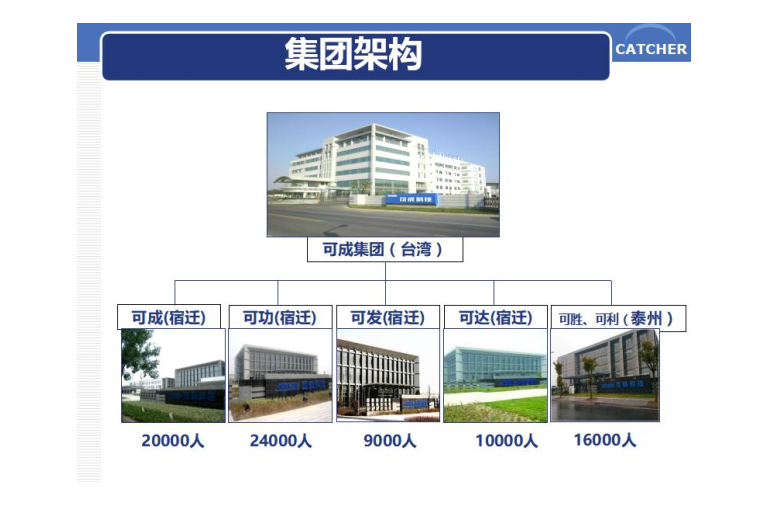 可成集团由台湾可成科技有限公司投资建立,可成集团总部位于台湾,在苏州、泰州、宿迁均有分公司。2012 年 12 月 9 日在泰州经济开发区成立可胜科技(泰州)有限公司,占地面积2100 亩,目前泰州可胜、可利已投入生产使用,可利厂在 2017 年 3 月正式投入量产。可成科技(宿迁)有限公司、可功科技(宿迁)有限公司、可发科技(宿迁)有限公司、可达科技(宿迁)有限公司、在 2003 年 --2008 陆续投产使用。目前员工总数达到 7.8 万名。
