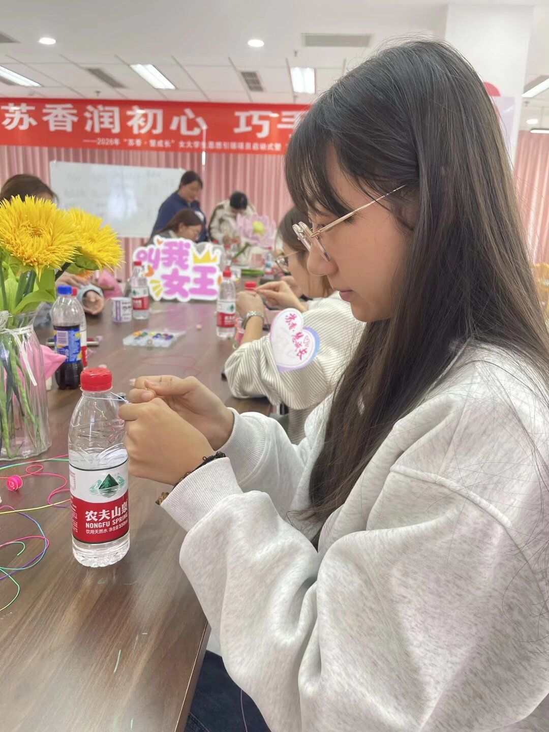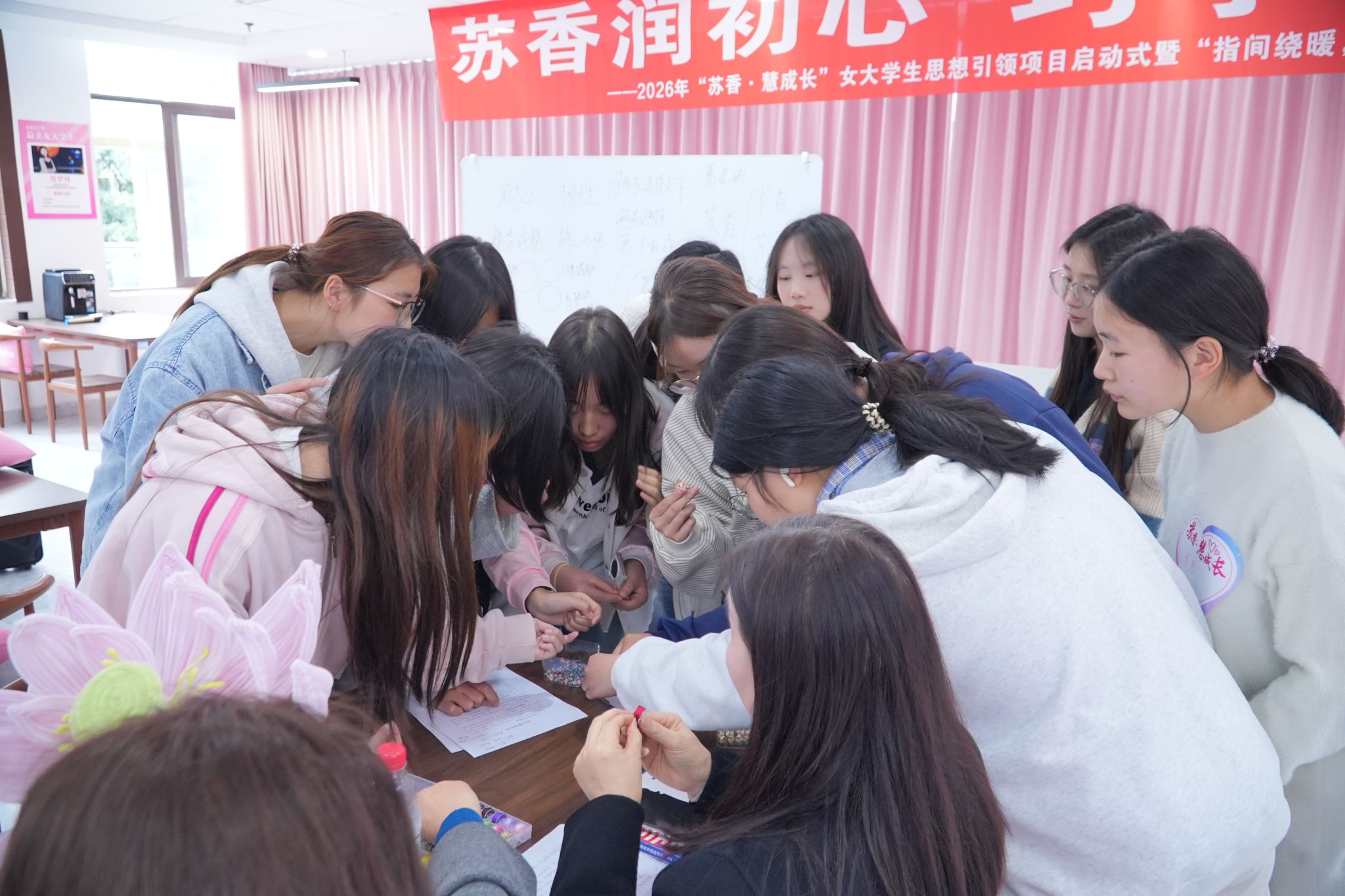 3月25日下午,“苏香润初心,巧手织芳华”——2026年“苏香·慧成长”女大学生思想引领项目启动式暨“指间绕暖,织愈时光”手工编织体验营开营活动在眉山职业技术学院巾帼驿站举行。学校机关党总支书记,工会办、妇联办主任,妇联主席,工会副主席邓惠明、旅游与财贸学院党总支书记袁娇出席活动。首期40余名女大学生共同参与。