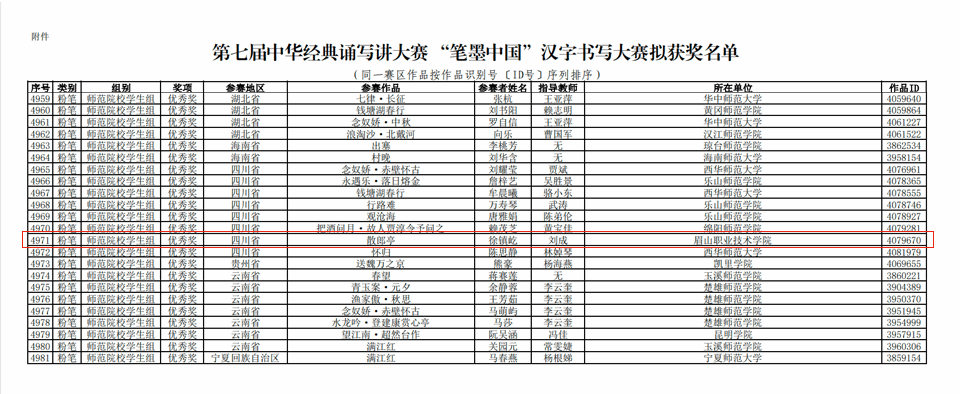 近日,由教育部、国家语言文字工作委员会主办的第七届中华经典诵写讲大赛获奖名单相继揭晓。我校学子在“诗教中国”诗词讲解大赛与“笔墨中国”汉字书写大赛两大赛事中双双斩获国家级奖项,实现历史性突破。