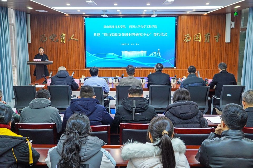 1月5日,学校与四川大学化学工程学院共建“眉山实验室先进材料研究中心”签约仪式在行政楼一楼会议室举行。四川大学化学工程学院院长郭孝东、学校党委书记代贤军出席签约仪式并讲话。学校党委副书记、校长刘兴勇,眉山市科技局四级调研员刘桥华,学校党委委员、副校长丁盛、杨加琼参加签约仪式。