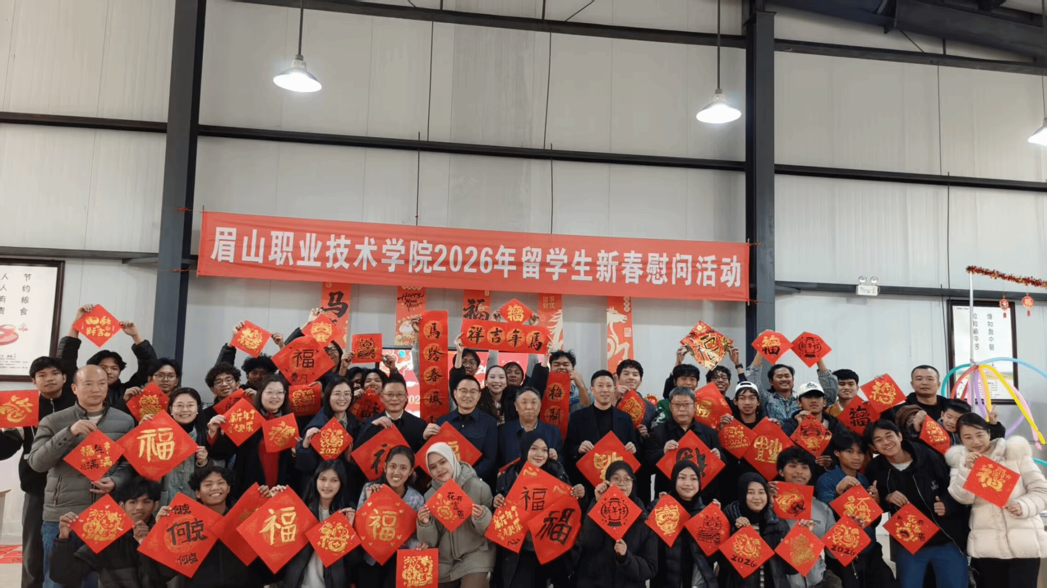 团圆聚餐环节,中外师生围坐畅谈,共品美食、共话情谊。学校与公司联合送上新春红包与慰问品,将“眉职大家庭”的关怀藏于细节,并以马年专属祝福寄语32名印度尼西亚留学生,愿他们如骏马奔腾,学业马到成功、生活精彩纷呈。
