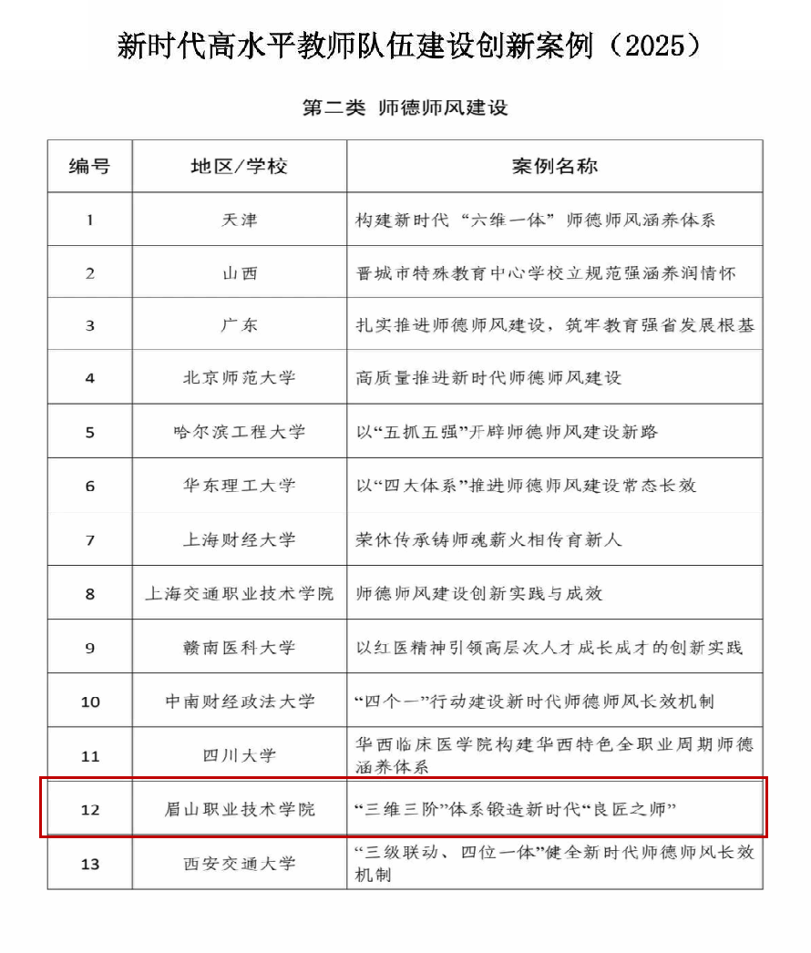 近日,由教育部教师工作司指导、中国教育报刊社组织的“新时代高水平教师队伍建设创新案例(2025)”评选结果揭晓,我校《“三维三阶”体系锻造新时代“良匠之师”》案例成功入选,成为四川省唯一上榜的高职院校。