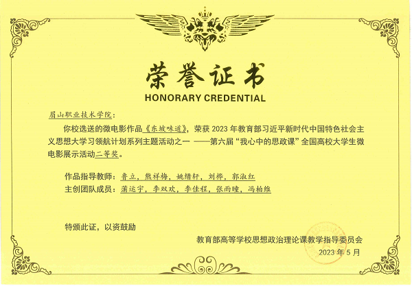 5月26日,第六届“我心中的思政课”全国高校大学生微电影展示活动颁奖典礼在武汉大学樱顶老图书馆隆重举行。我校马克思主义学院推送的思政微电影《东坡味道》荣获全国二等奖,指导教师郭淑红、康鑫到场领奖。