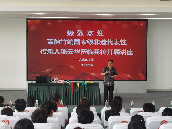 5月29日,文化艺术系在学校招就中心二楼多功能厅开展讲座,青神竹编国家级非遗代表性传承人、工艺美术师陈云华受邀主讲。学校党委委员、工会主席彭书君出席,文化艺术系主任余莲君主持。