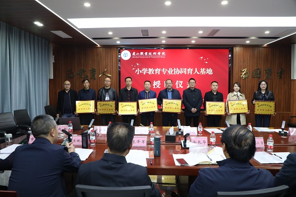 会议还为徐长华,张泽军两位小学教育专业特聘专家和10位校外兼职教师颁发了证书,基地小学代表张霞、周琴分享了与小学教育专业协同育人的经验。