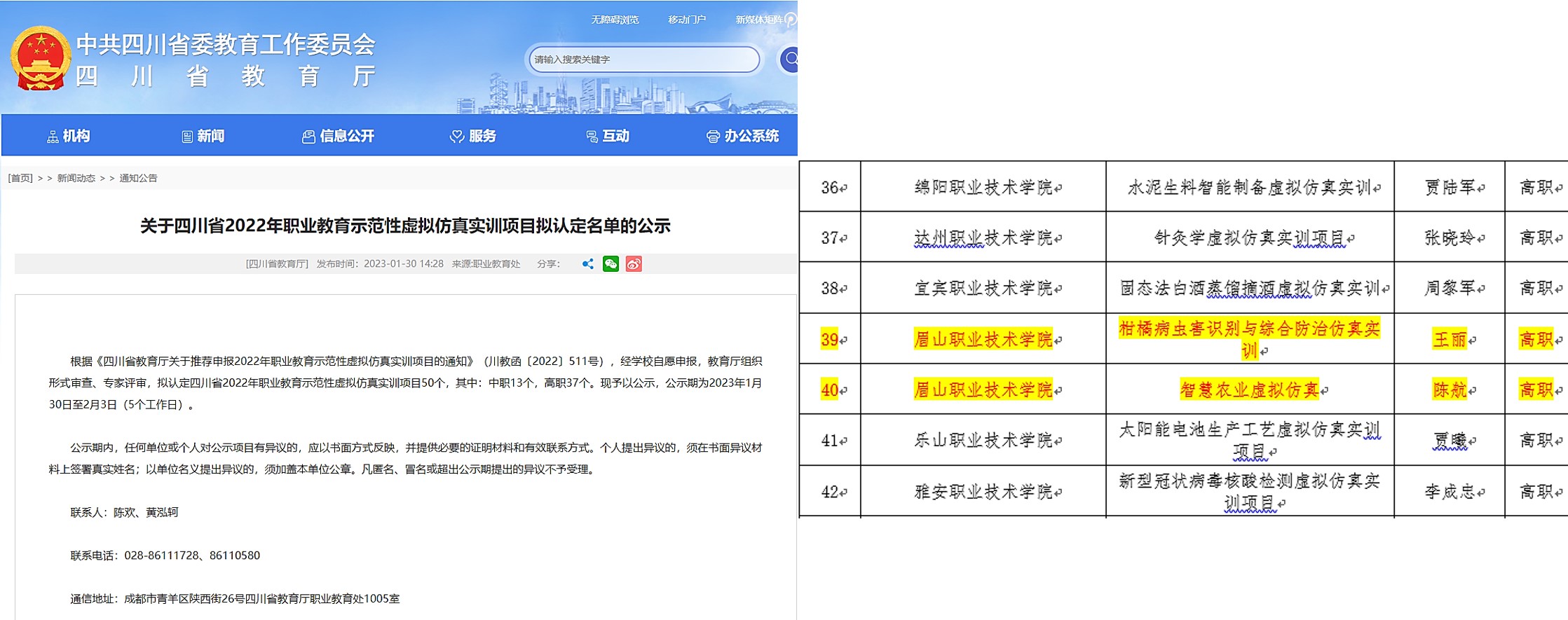 近日,四川省教育厅发布了关于四川省2022年职业教育示范性虚拟仿真实训项目拟认定名单的公示,我校教师王丽的“柑橘病虫害识别与综合防治仿真实训”和陈航的“智慧农业虚拟仿真”项目双双入选。