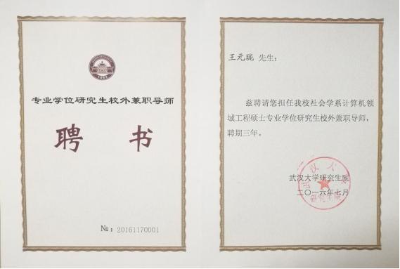 学院党委书记王元珑教授担任武汉大学专业学位研究生校外兼职导师。