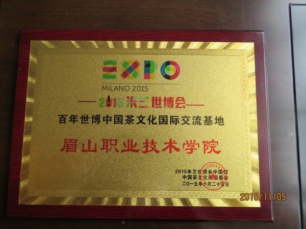 中国教育国际交流协会对参加米兰世博会“中国故事·中国茶”大学生茶艺团团员进行了表彰,并授予学院“百年世博中国茶文化国际交流基地”。2015米兰世博会中国茶文化周组委会秘书长夏涤斌主持表彰大会。协会秘书长生建学为学院授牌、为郭潇同学颁奖。学院大学生茶艺表演队也正式列为中国教育国际交流协会会员,协会也将每年在学院学生中进行团员选拔,以宣传与弘扬中国茶文化。