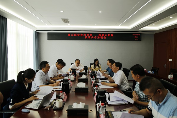 5月11日,学校与通威太阳能在行政楼三楼会议室举行校企合作洽谈会,学校党委书记代贤军、通威太阳能总经理助理陈君出席洽谈会。