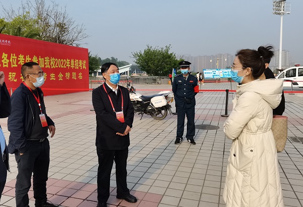 考试期间,学校党委书记代贤军,党委副书记、院长徐井万及相关领导深入考场区域查看考试工作。代贤军强调,要按照省教育厅、省教育考试院单招考试要求,以最高标准、最严要求加强组织领导,强化责任落实,做好2022年单招考试工作;要抓好考务工作,严肃考场纪律,强化监督检查,细化服务内容,确保考试顺利圆满完成;要抓实疫情防控工作,严格落实省、市和学校疫情防控要求,精准施策,加强对考生考试的全过程管理,确保校园安全稳定。