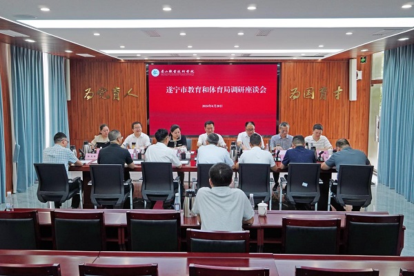 6月20日,遂宁市委教育工委书记、市教体局党组书记、局长王松带队到校调研座谈。学院党委副书记、院长刘兴勇,眉山市委教育工委副书记、市教体局党委委员周天才陪同调研。