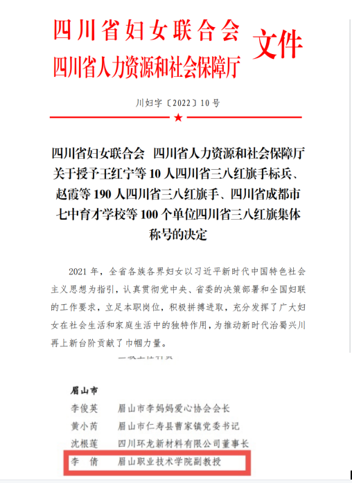 在2022年国际劳动妇女节来临之际,省妇联、省人社厅联合发文,通报表彰被授予省三八红旗手、三八红旗集体的单位和个人。学校商贸旅游系教师李倩被授予四川省“三八红旗手”荣誉称号,是我市教育系统的唯一代表。