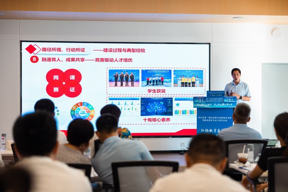 付军在讲话中指出,教育是强国建设、民族复兴之基,新征程上四川现代化建设离不开教育和人才的坚强支撑。四川是教育大省,职教大省,职教总体办学规模居全国第五、西部第一。要以此次活动为契机,深刻把握教育家精神的时代内涵与实践要求,将其转化为推动职教改革创新、提升育人质量的动力,为加快建设教育强省、谱写中国式现代化四川新篇章作出新的更大贡献。要增强弘扬教育家精神的思想自觉和行动自觉,将教育家精神内化于心、外化于行,胸怀“国之大者”,坚守为党育人、为国育才的初心使命,以崇高的教育情怀、卓越的专业追求和无私的奉献精神,投身到新时代职业教育改革发展的伟大实践中。要建设高素质专业化职教师资队伍,优化教师培训,强化名师引领,突出“双师型”教师培养,加大对薄弱地区支持,打造一支政治素质硬、业务能力强、育人水平高的职教教师队伍。要提升职教服务经济社会发展的能力,深化产教、校企合作,紧密对接国家战略与四川发展需求,推动职普融通、科教融汇,强化内涵建设,提升关键办学能力,打造特色职教品牌,彰显职教价值,为地方发展提供有力支撑。
