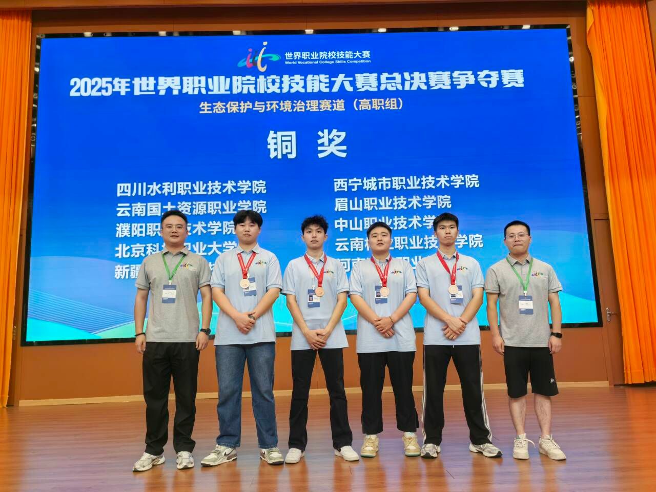 8月25日至 30 日,2025 年世界职业院校技能大赛生态保护与环境治理赛道(安全方向)(高职组)总决赛在江西环境工程职业技术学院激战落幕。由我校教师陈鹏宇、付朝庭指导的参赛队伍,从全国 29 个省份的 109 支劲旅中突围,斩获铜奖。