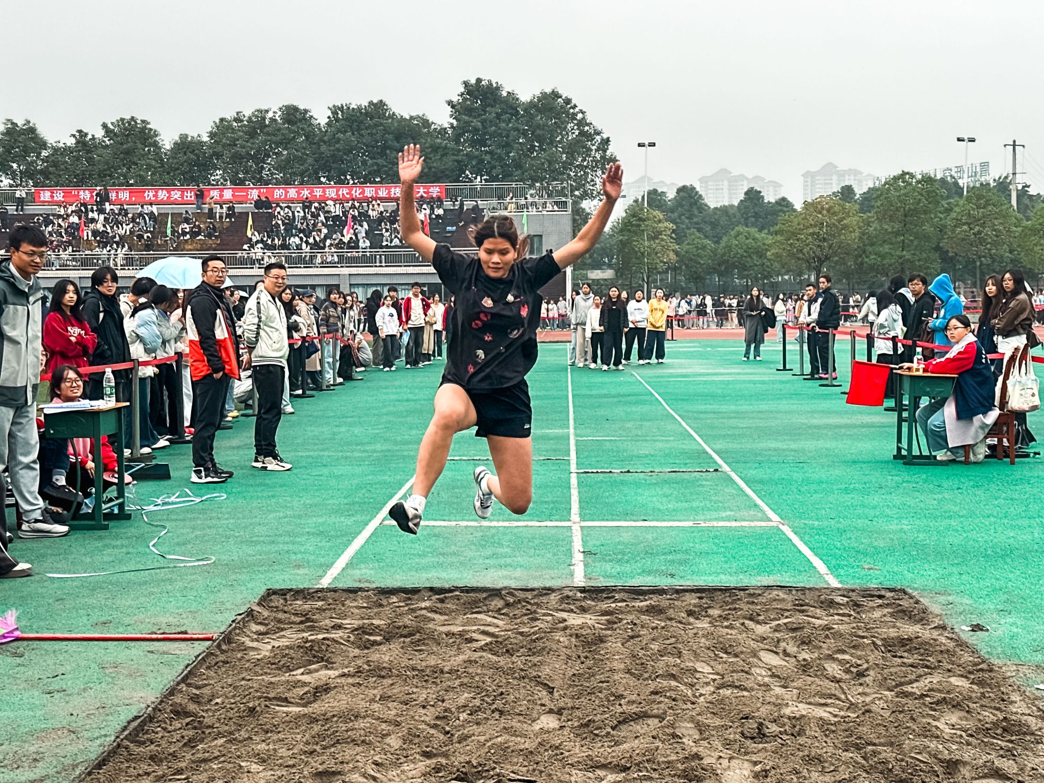 跳高场上,健儿们助跑、起跳、腾空、过杆,身体划出优美的弧线;跳远和三级跳远的沙坑旁,每一次有力的踏板和奋力的跃起,都引来阵阵喝彩;实心球划破长空,承载着力量与技巧的完美结合;跳绳赛场,绳影翻飞,选手们身轻如燕,单摇稳健,双摇迅疾,令人目不暇接。整个运动场沉浸在一片紧张、激烈而又友好、团结的氛围之中。