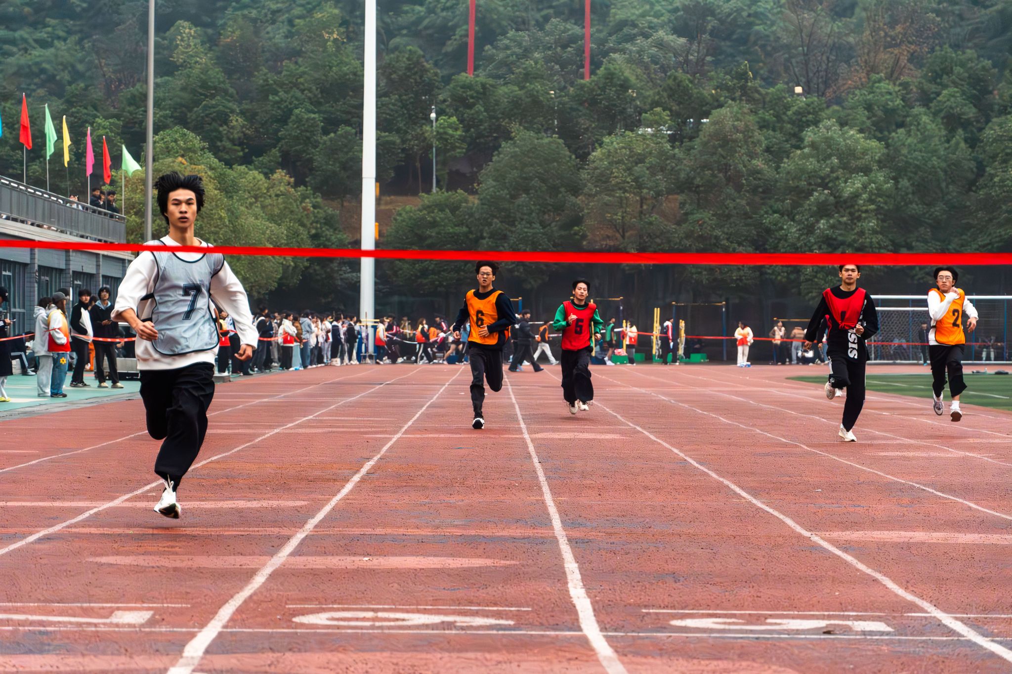开幕式结束后,各项赛事随即在运动场全面展开。红色的环形跑道上,随着发令枪响,参加100米跑步的运动员如离弦之箭般冲出起跑线,他们奋力摆臂,步伐铿锵,眼神中充满了对胜利的渴望。中长跑赛场上,运动员们则用坚韧的毅力诠释着永不言弃的体育精神,每一步的坚持都深深感染着场边的观众,加油声、呐喊声此起彼伏,汇成一片热情的海洋。